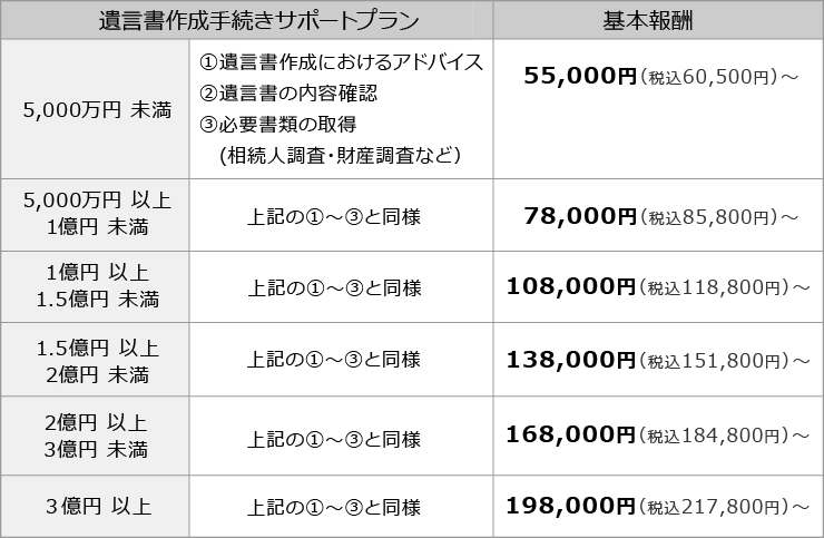 自筆証書遺言については、法的効力のある遺言に仕上げるための細かな打合せが必要となりますので、上記費用に加えて55,000円(税込)の報酬をいただいております。
